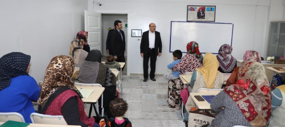 Belediye Başkan yardımcısı Mehmet Demir ve İlçe Müftüsü Selahattin Özçelik ile birlikte bayanların kurs aldığı merkezleri ziyaret eden Belediye Başkanı Mehmet Sarı, verilen hizmetleri yerinde görerek bilgi aldı.